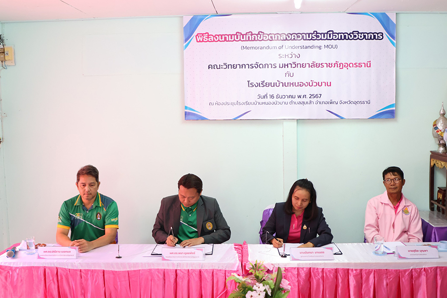 มหาวิทยาลัยราชภัฏอุดรธานีมีนโยบายในการเป็น “สถาบันแห่งการเรียนรู้ สร้างนวัตกรรมและปัญญา สู่การพัฒนาท้องถิ่น” ด้วยการนำเป้าหมายของการพัฒนาอย่างยั่งยืน (Sustainable Development Goals : SDGs) มาเป็นแนวทางในการดำเนินงาน วันที่ 16 ธันวาคม พ.ศ. 2567 คณะวิทยาการจัดการ มหาวิทยาลัยราชภัฏอุดรธานี นำโดย ผู้ช่วยศาสตราจารย์ ดร.พนา ดุลยพัชร์ คณบดีคณะวิทยาการจัดการ และ โรงเรียนบ้านหนองบัวบาน โดย นางฉันทนา มาเนตร ผู้อำนวยการโรงเรียนบ้านหนองบัวบาน ได้ร่วมลงนามบันทึกข้อตกลงความร่วมมือทางวิชาการ ณ ห้องประชุมโรงเรียนบ้านหนองบัวบาน ตำบลสุมเส้า อำเภอเพ็ญ จังหวัดอุดรธานี ความร่วมมือครั้งนี้มีวัตถุประสงค์เพื่อพัฒนาคุณภาพการศึกษา ส่งเสริมการเรียนการสอน และยกระดับศักยภาพของบุคลากรทางการศึกษา ตลอดจนสร้างโอกาสทางการเรียนรู้ให้กับนักเรียนและนักศึกษา ทั้งในด้านวิชาการและการปฏิบัติจริง โดยทั้งสองฝ่ายจะร่วมมือกันในการจัดกิจกรรมการเรียนรู้ การฝึกอบรม และโครงการพัฒนาต่าง ๆ อย่างต่อเนื่อง